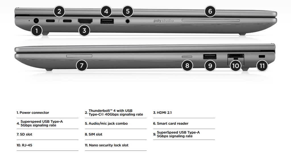 Left side: 1 USB Type-A 5Gbps signaling rate (charging); 1 HDMI 2.1; 1 headphone/microphone combo; 1 power connector; 2 Thunderbolt™ 4 with USB4 Type-C® 40Gbps signaling rate (USB Power Delivery, DisplayPort™ 2.1) ; Right side: 1 USB Type-A 5Gbps signaling rate; 1 RJ-45; 1 SD card reader; 1 nano security lock slot